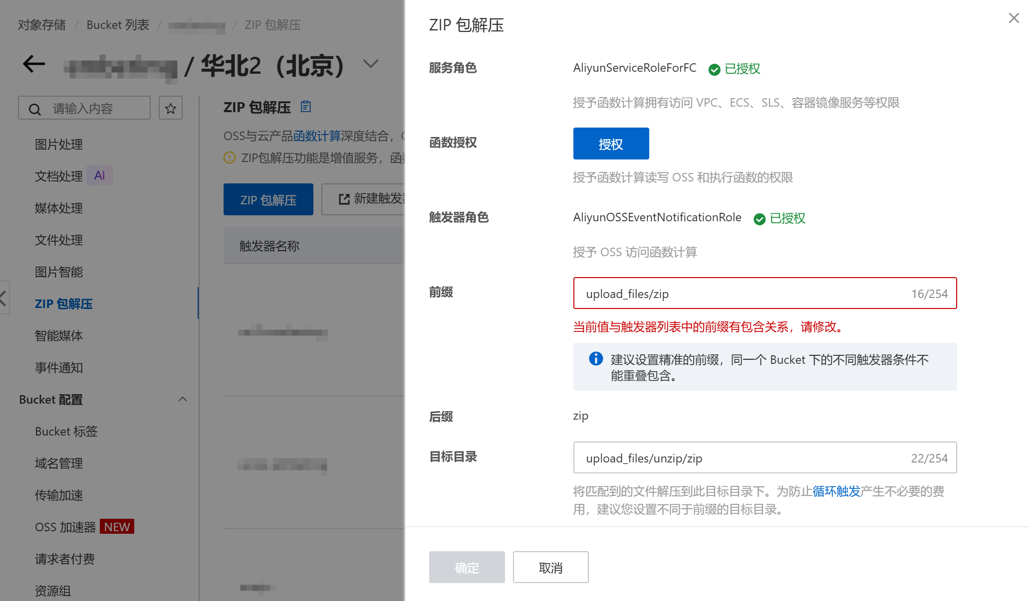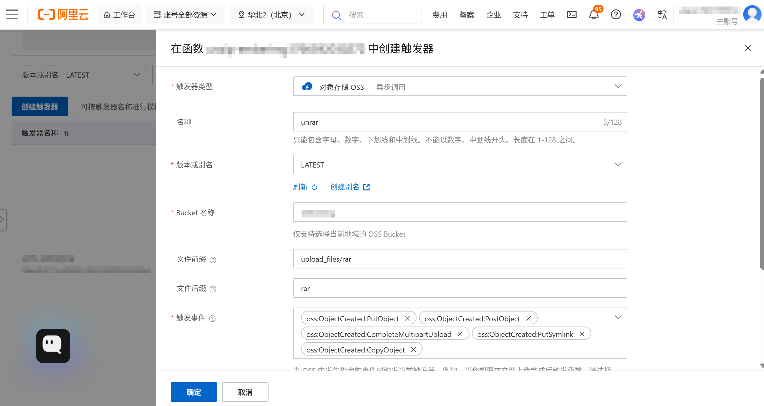 注意: 这里的前缀和目标目录最好不能有父子目录关系,否则如果解压后的文件仍然有压缩包,会导致无限循环解压。创建完成后,进入函数计算控制台,找到该函数。可以看到已经自动生成了一个