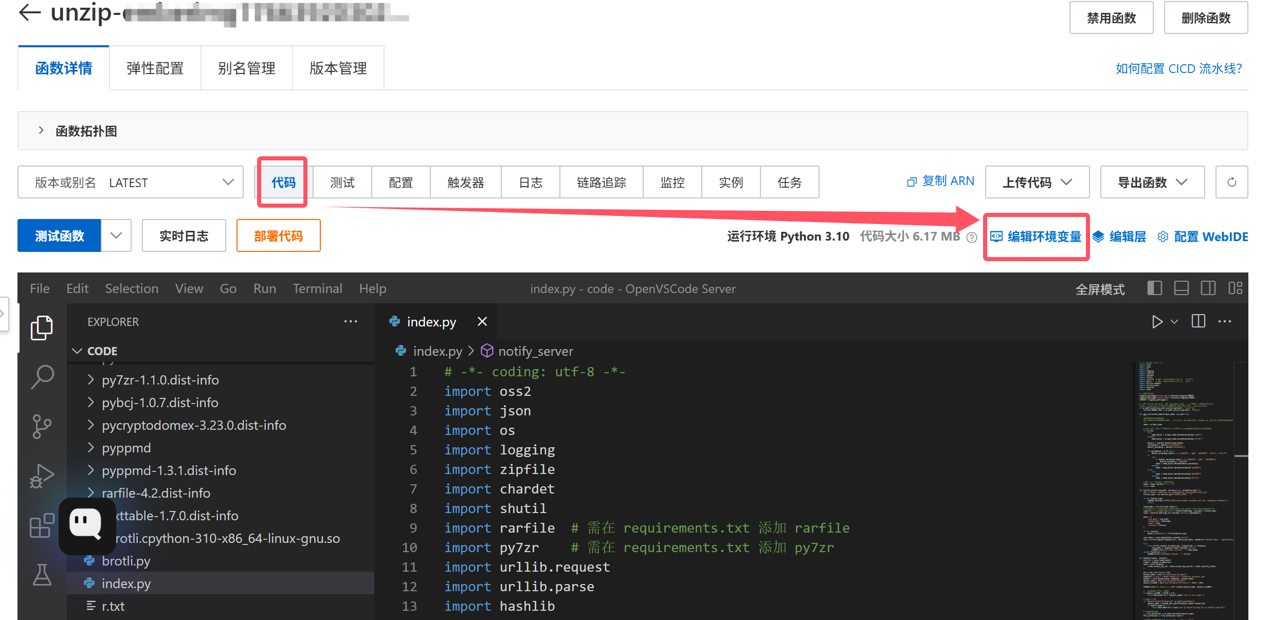 现在Web VSCode文件管理器左侧目录里应该有:index.py、unrar 文件、以及一大堆 py7zr 等文件夹。然后我们开始写index.py的代码。这是我的代码,复用了模板中对文件名的编码修正(这个非常重要,实测没修正解压出来会有很多乱码),并且实现了解压成功或失败都回调应用服务器的逻辑。
